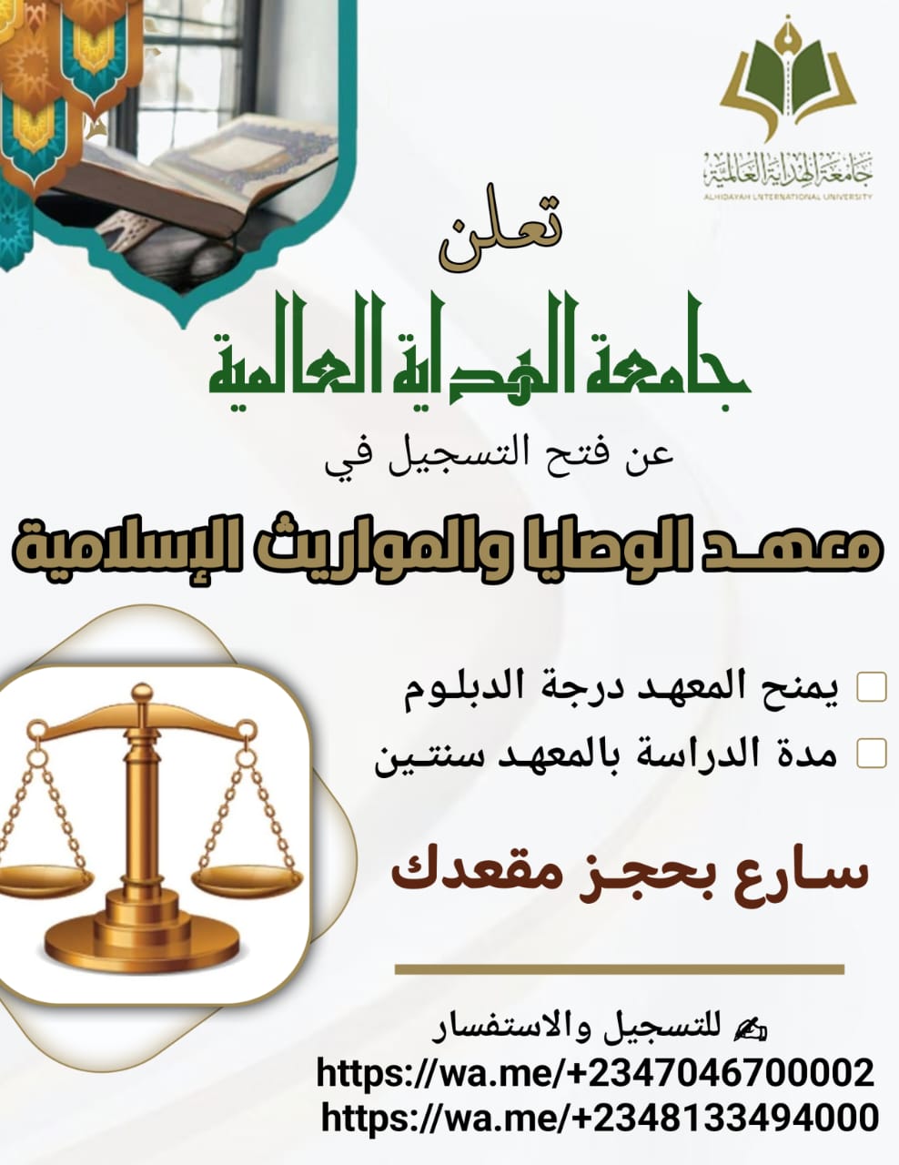يسر جامعة الهداية العالمية أن تعلن عن فتح باب التسجيل لمعهد المواريث والوصايا على المذاهب الاربع(المذهب الحنبلي – المذهب الشافعي-المذهب الحنفي – المذهب المالكي)
